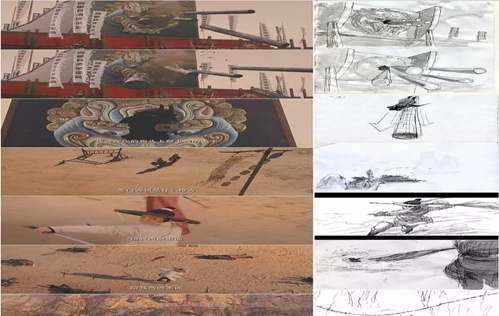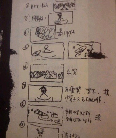 分鏡頭腳本又稱攝制工作臺本,也是將文字轉(zhuǎn)換成立體視聽形象的中間媒介,主要任務(wù)是根據(jù)解說詞和電視文學(xué)腳本來設(shè)計相應(yīng)畫面,配置音樂音響,把握片子的節(jié)奏和風(fēng)格等。分鏡腳本中畫面部分,一般是手繪分鏡。我們來看下徐克、馮小剛、姜文這三位知名導(dǎo)演的手繪分鏡。